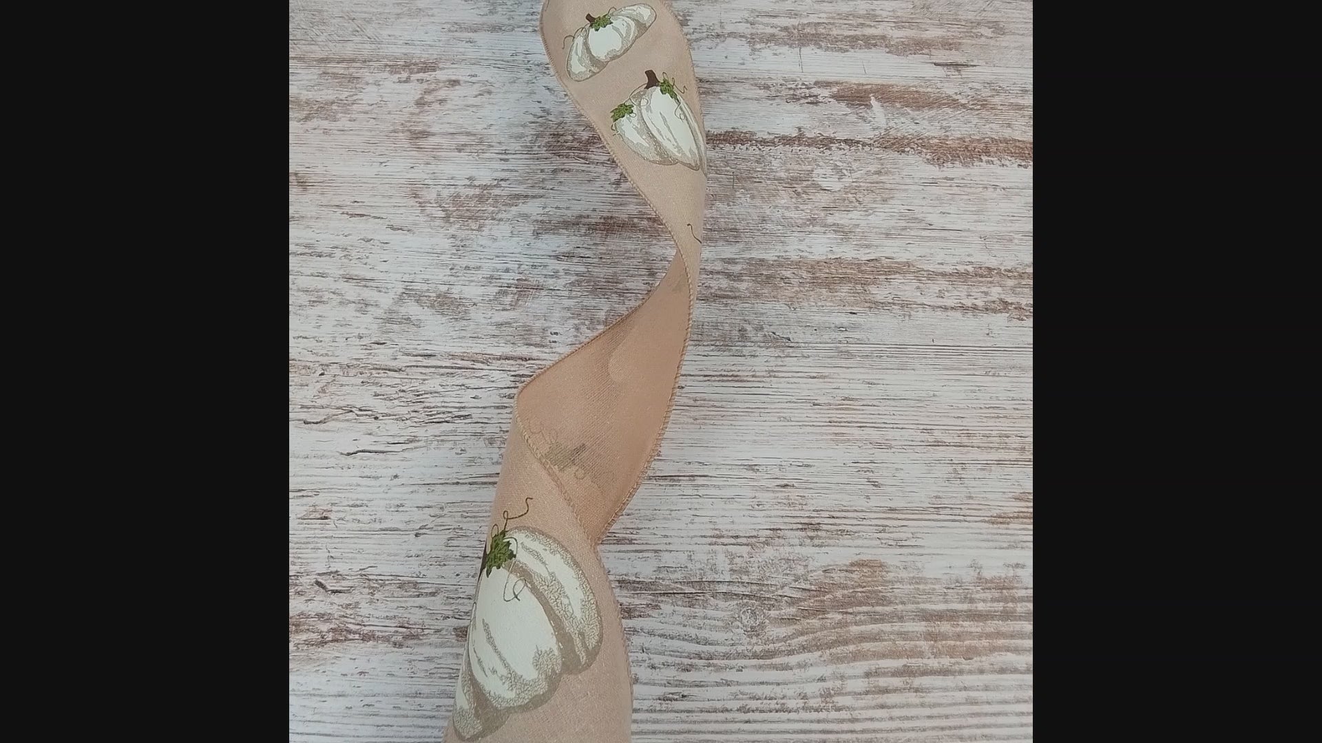 Fall White Pumpkin with Leaves Wired Ribbon (2.5 Inches, Tan Beige, Moss, Cream, Brown) - 10 Yards