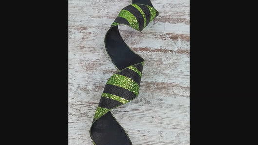 Glitter Diagonal Stripe Halloween Wired Ribbon : Black, Lime Green - 2.5 inches x 10 Yards (30 Feet)