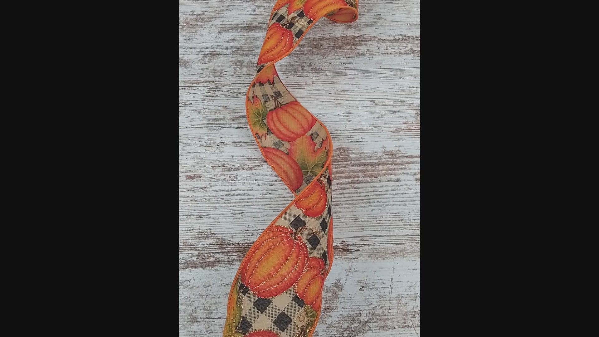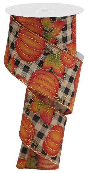 Glitter Pumpkin with Leaves on Check Wired Ribbon : Beige - 2.5 Inches x 10 Yards (30 Feet)